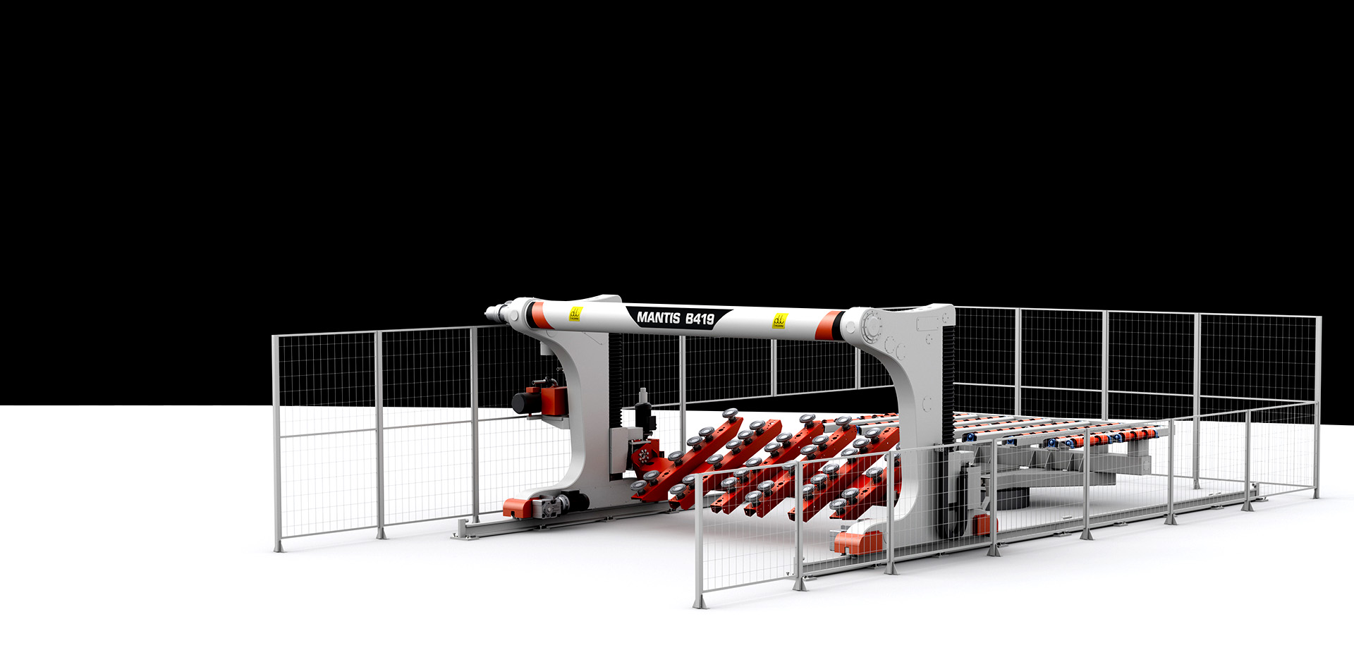 MANTIS B419 is an automatic loader/unloader for book match processing with ground level translation. To be combined with a rotating comb shaped roller bench and with a slab support.