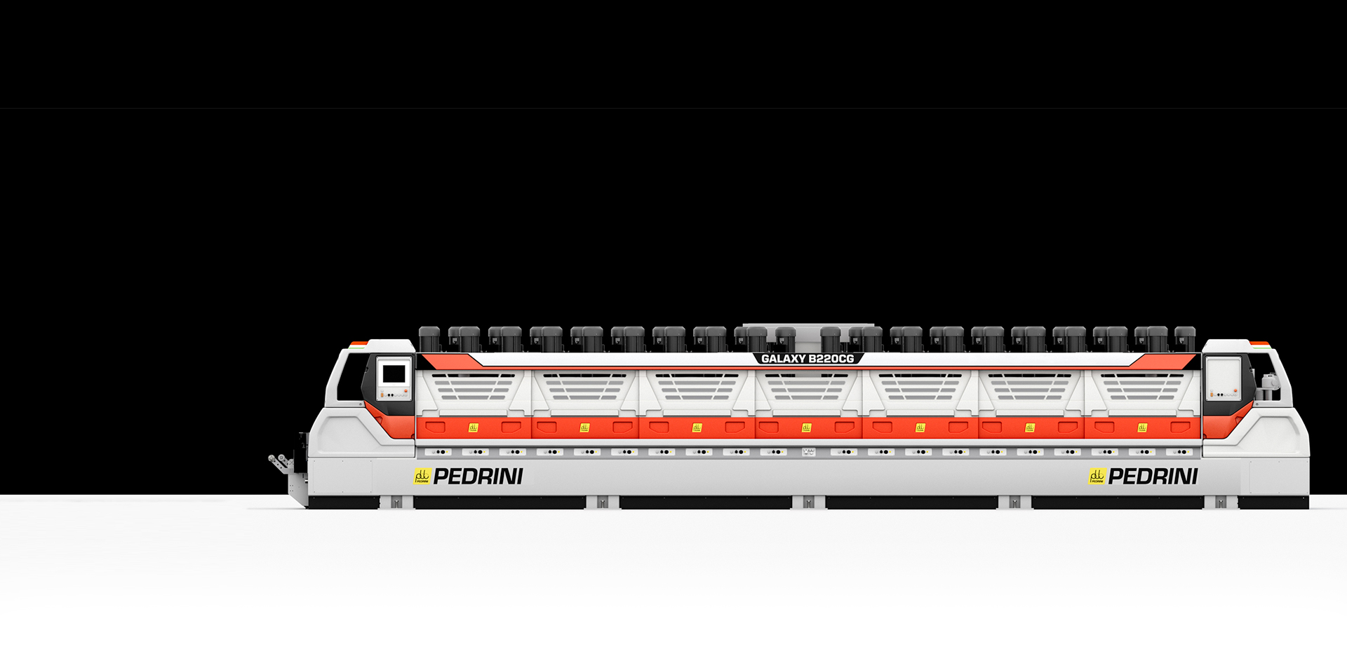 La risposta di Pedrini a queste nuove esigenze è la calibratrice-levigatrice GALAXY B220CG. GALAXY B220CG è equipaggiata con una sequenza di teste operatrici, a platorelli diamantati nelle prime posizioni e a settori oscillanti nelle successive.