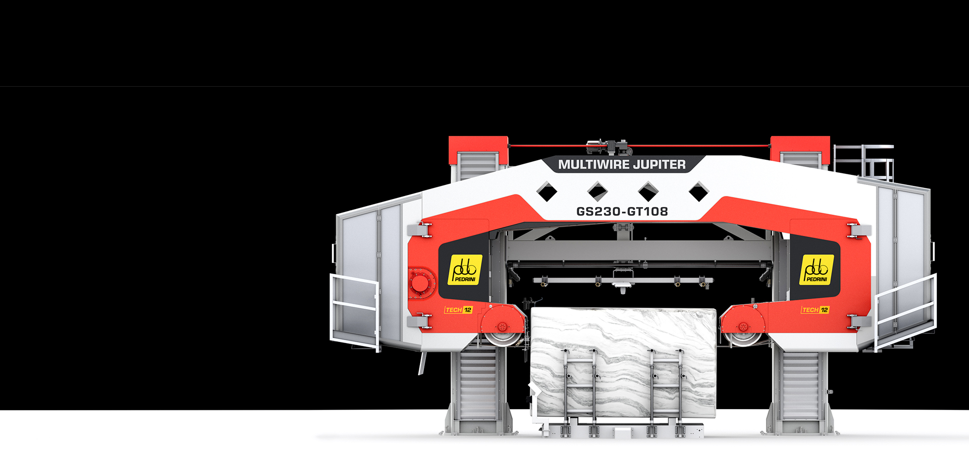 Dotata di ben 6 brevetti, MULTIWIRE JUPITER TECH12 si caratterizza per la sua flessibilità, affidabilità, per le soluzioni tecniche di avanguardia assoluta e per la sua altissima capacità produttiva. Infatti, la nuova multifilo per granito e marmo firmata Pedrini aumenta notevolmente la resa del blocco portandola a 55,5m2 per ogni metro cubo tagliato.