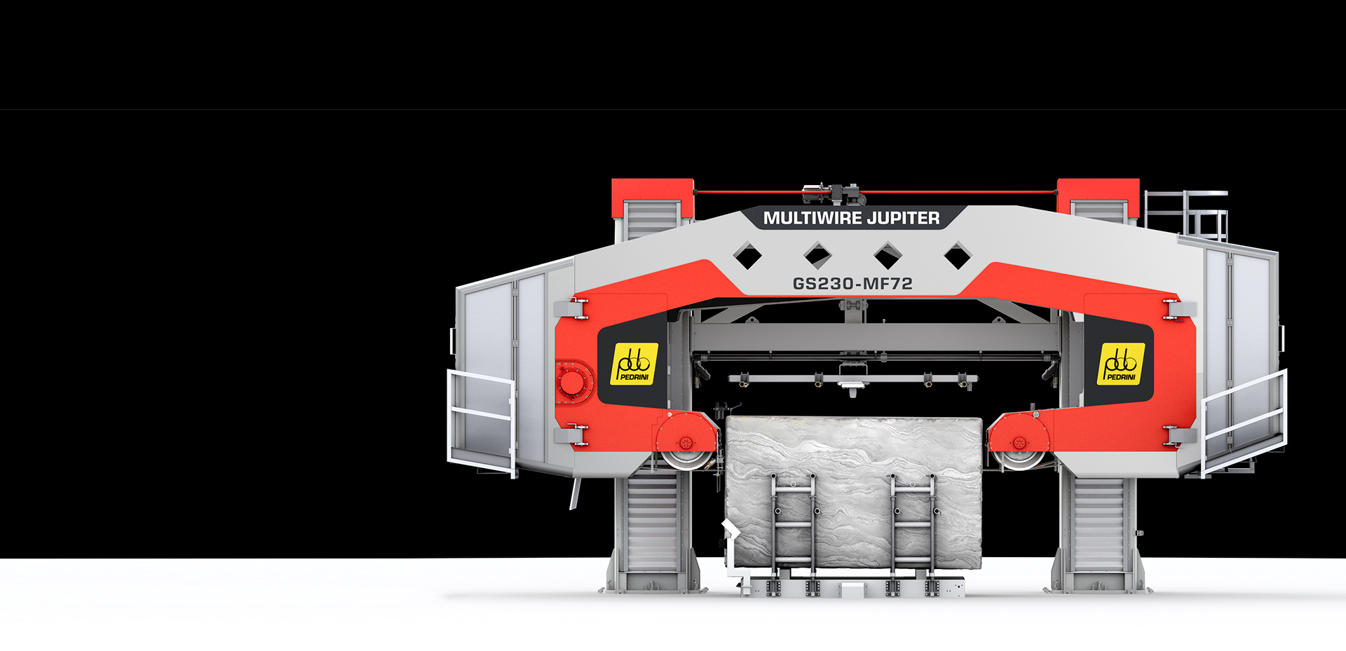MULTIWIRE JUPITER GS230 is an open frame multiwire machine for the production of marble slabs that performs block fast cutting with a series of diamond wires. It is available in several versions that differ in the maximum number of wires and for the diameter of diamond wires (6.3 mm - 5.3 mm).