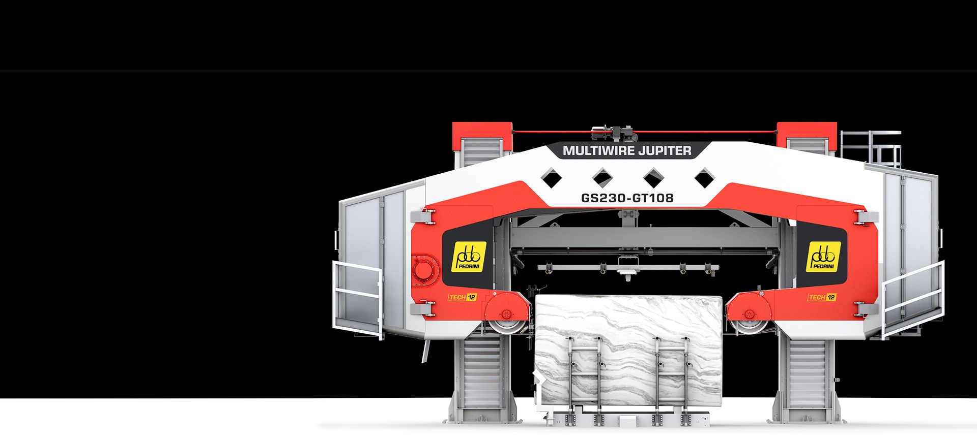 Dotata di ben 6 brevetti, MULTIWIRE JUPITER TECH12 si caratterizza per la sua flessibilità, affidabilità, per le soluzioni tecniche di avanguardia assoluta e per la sua altissima capacità produttiva. Infatti, la nuova multifilo per granito e marmo firmata Pedrini aumenta notevolmente la resa del blocco portandola a 55,5m2 per ogni metro cubo tagliato.